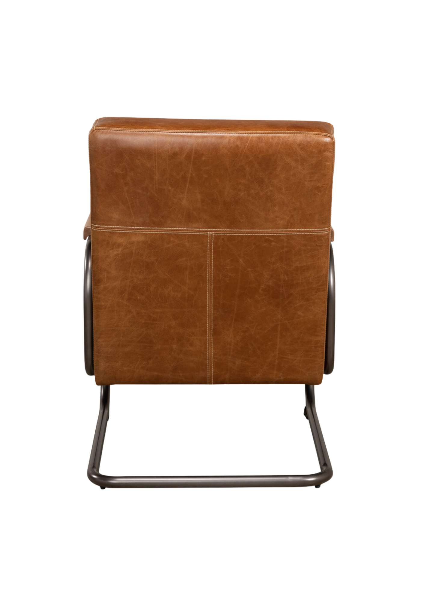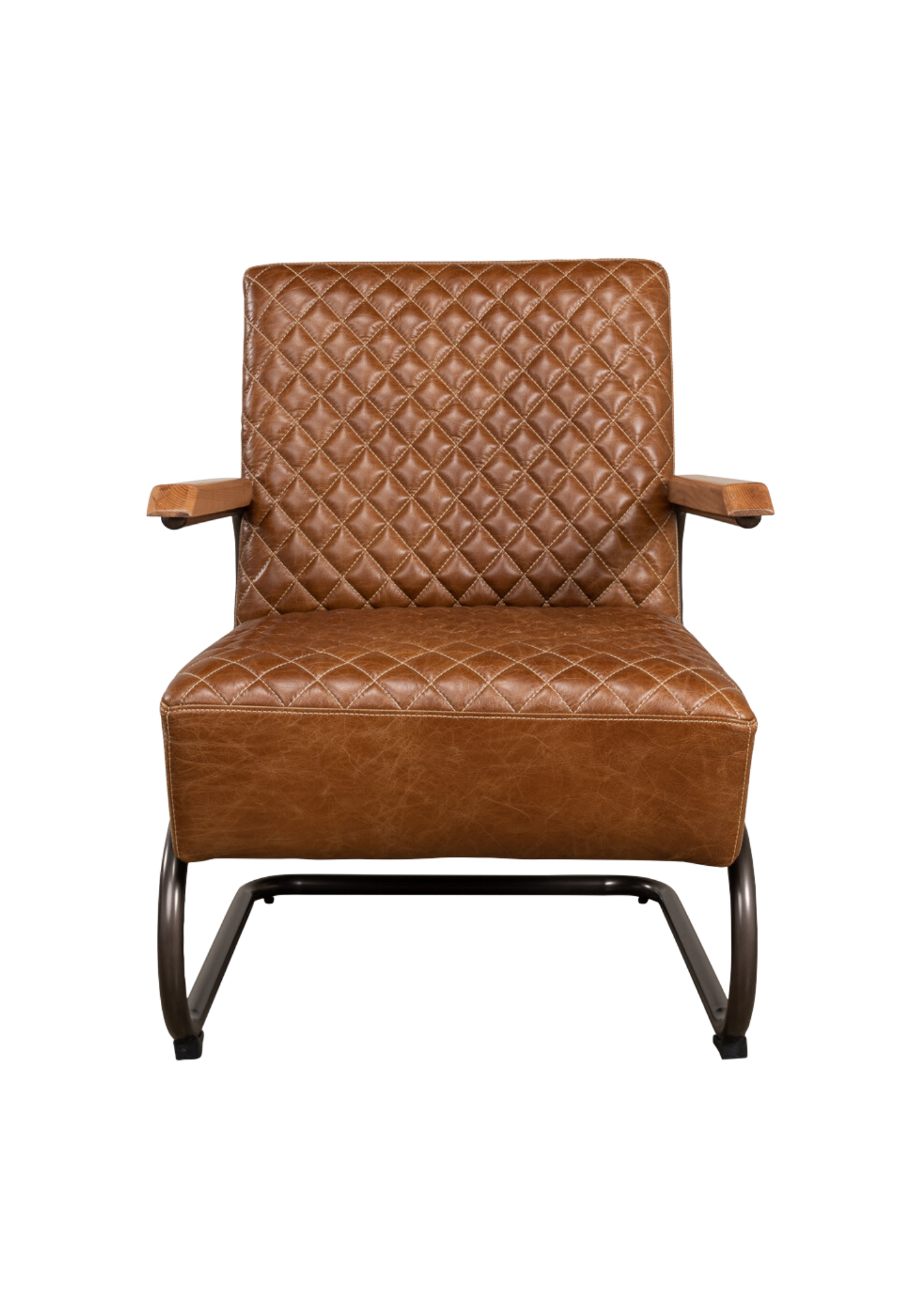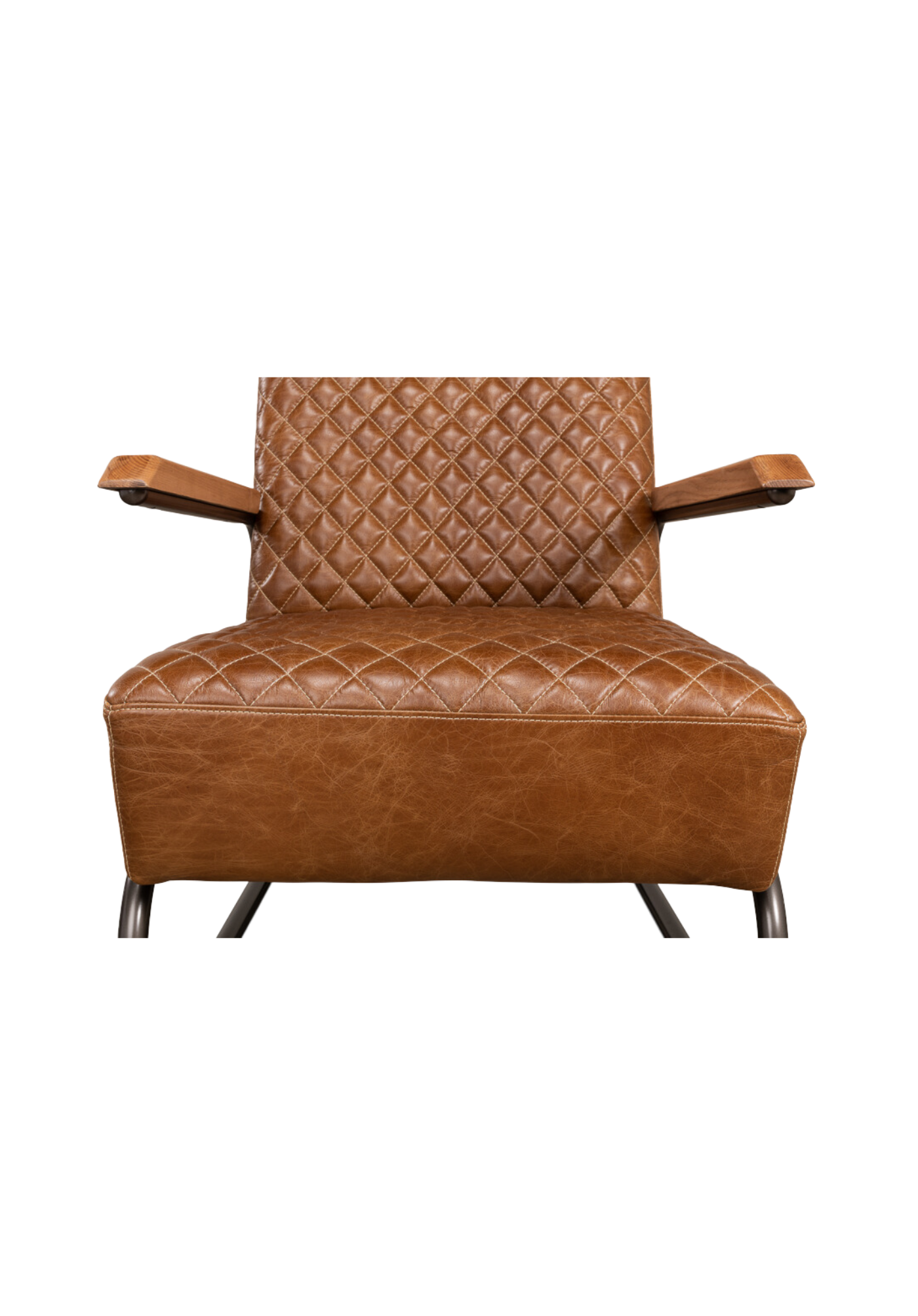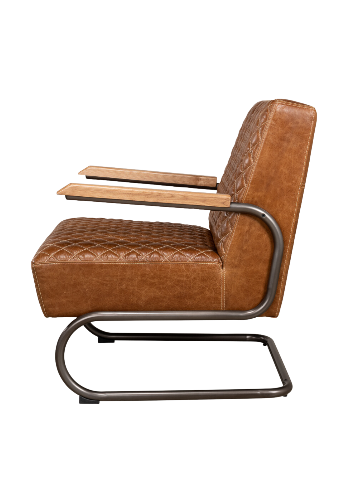 This chair is carefully designed for maximum comfort. Its curved frame provides an ergonomic shape that is both visually appealing and comfortable. Upholstered in top-grain quilted leather, and featuring warm wood tones and metal accents, this chair looks and feels luxurious.