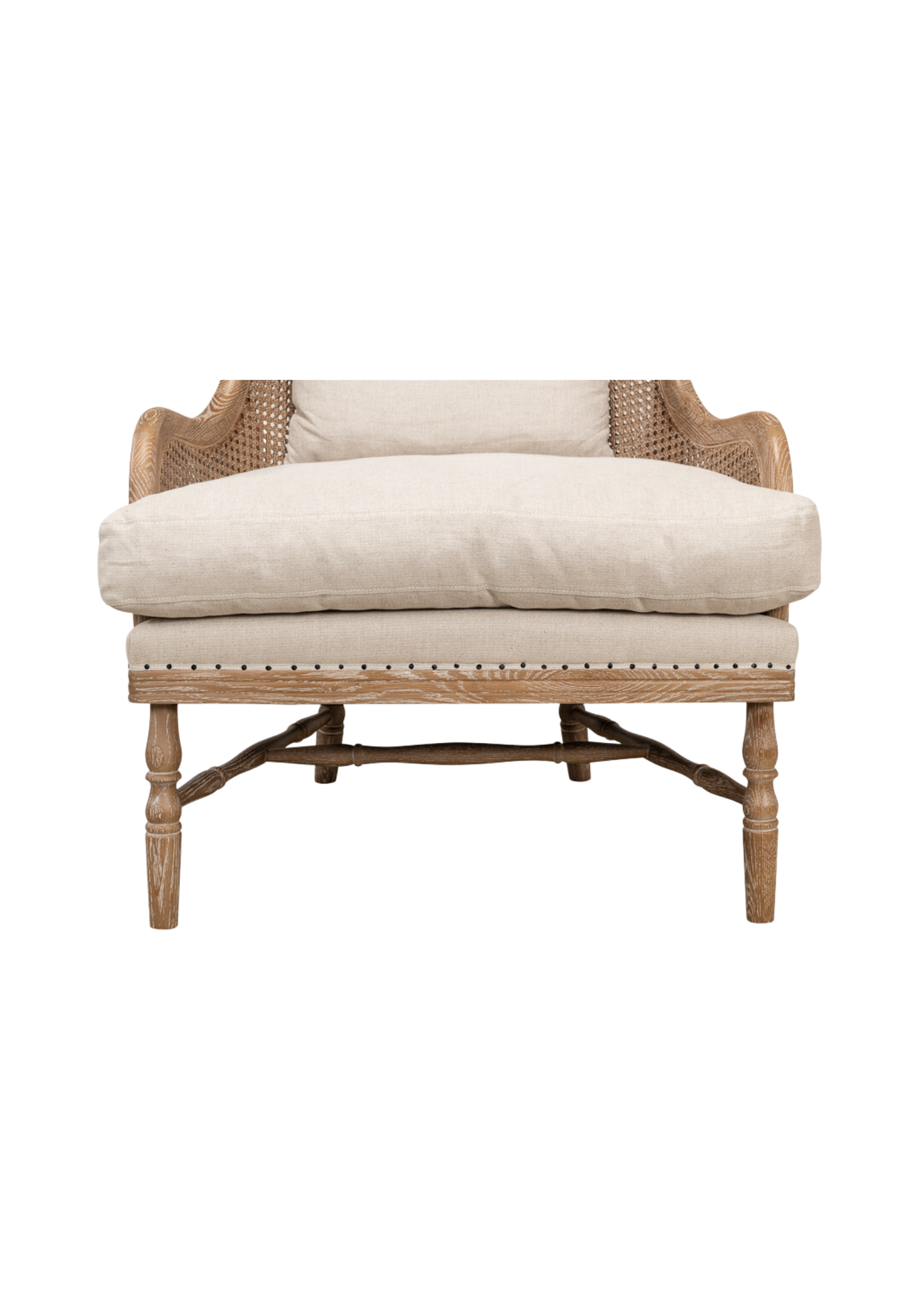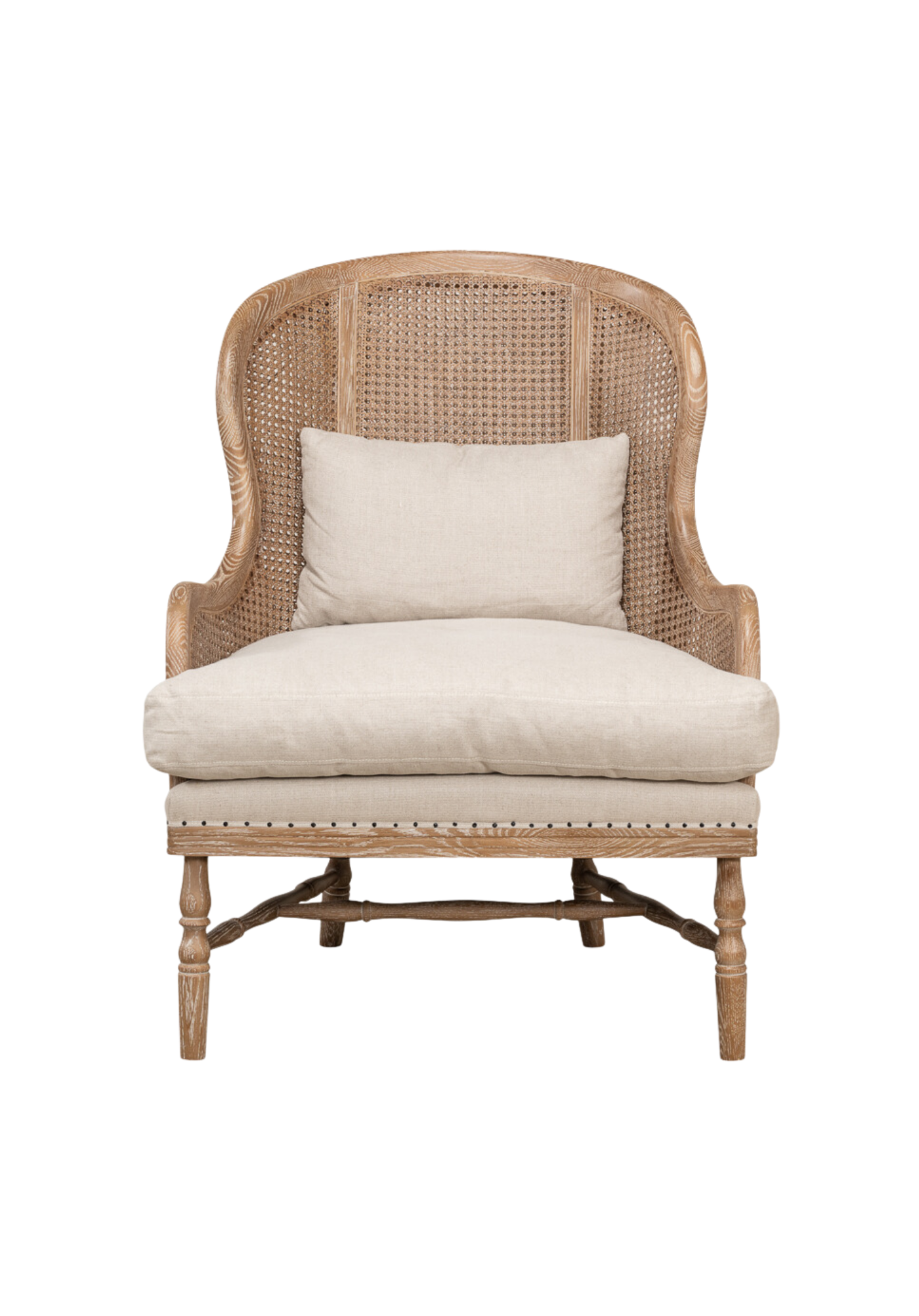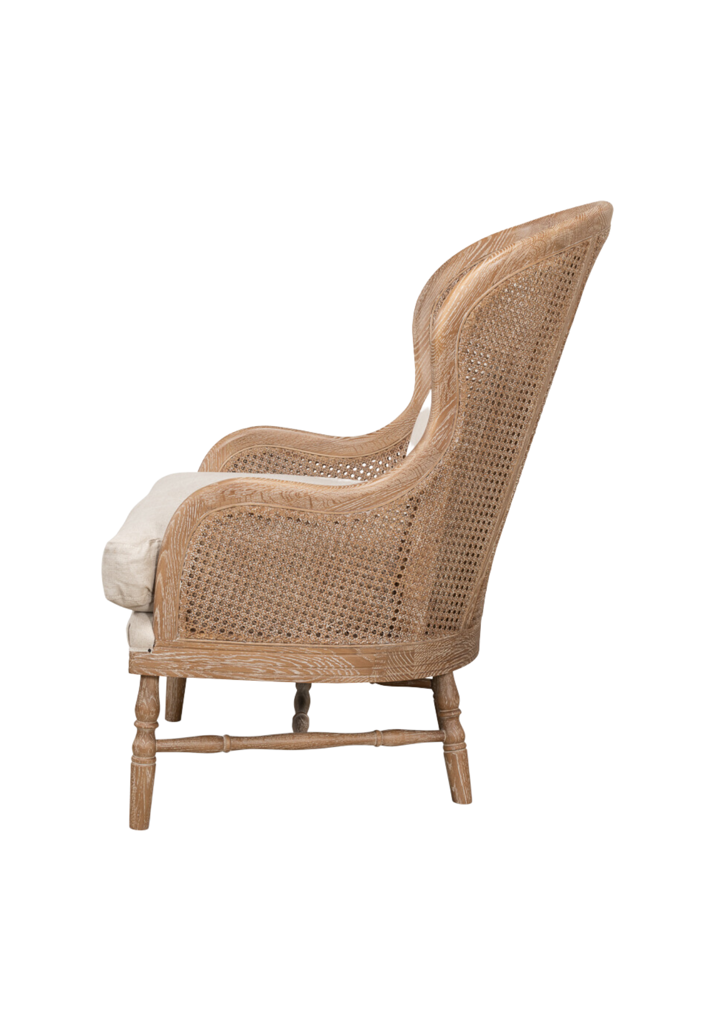 Experience classic romance with the Greta Wing Chair. Handcrafted from oak with a white wash finish, luxurious 100% natural linen, and plush down/foam fill, this timeless piece is perfect for those special moments.