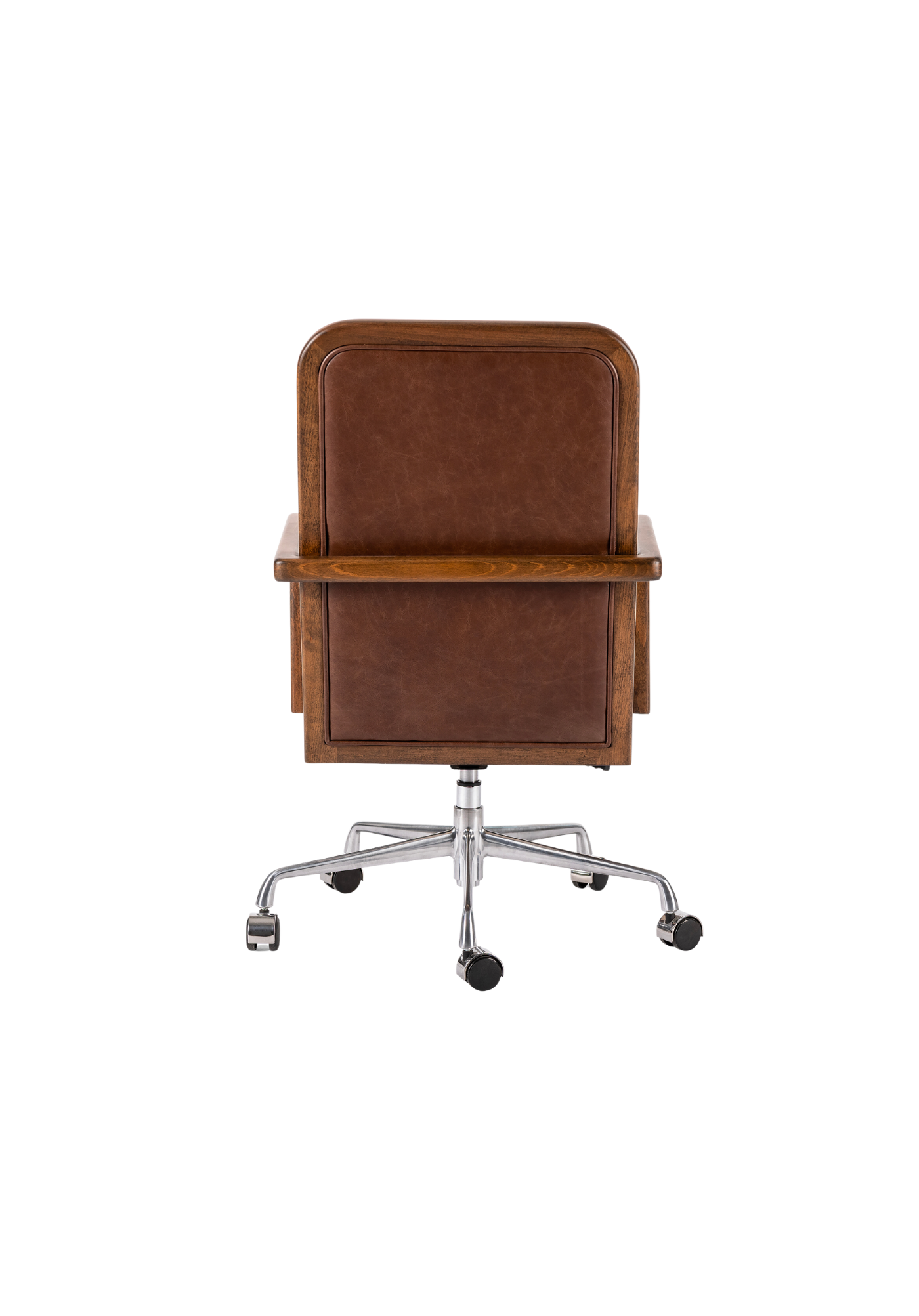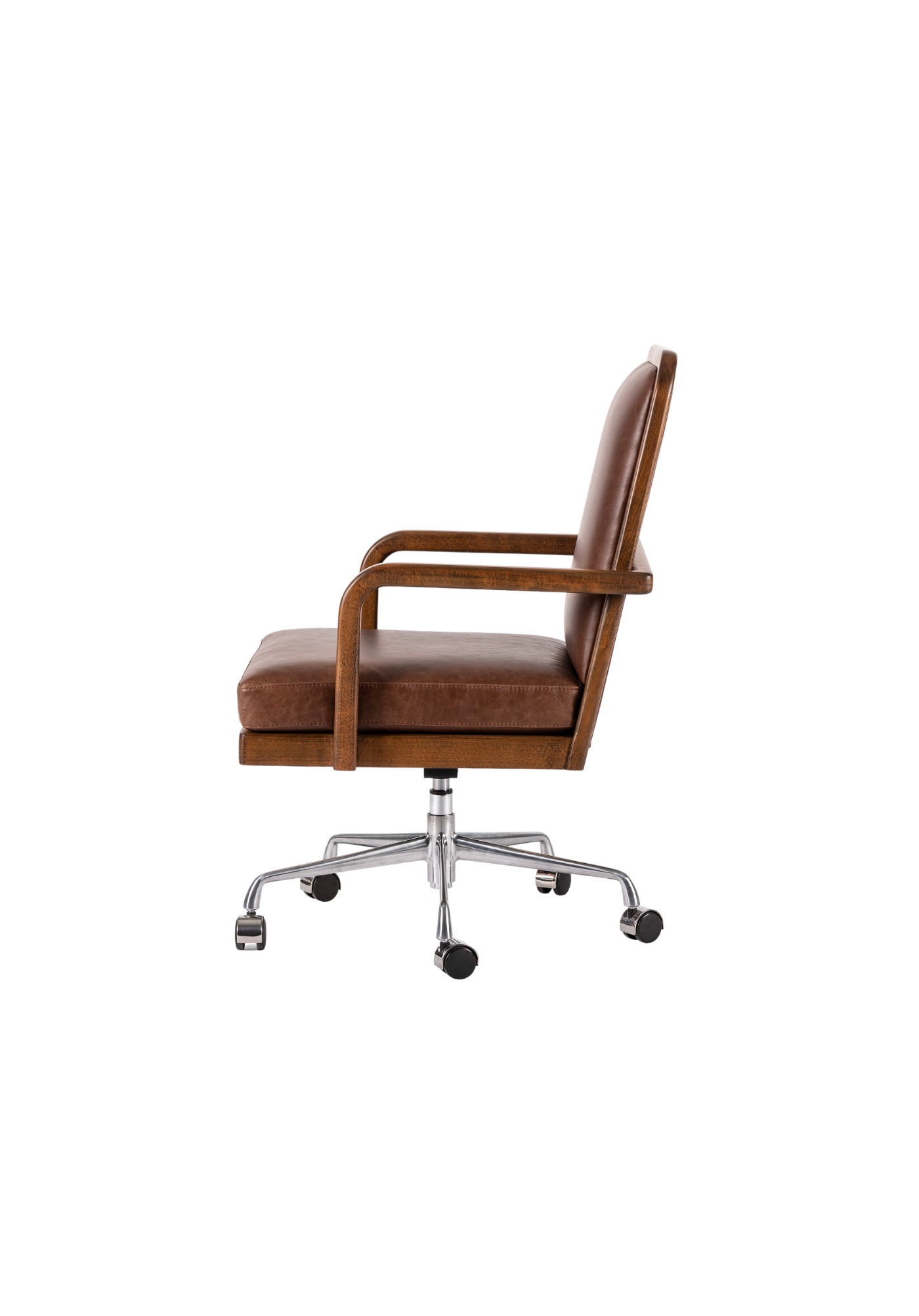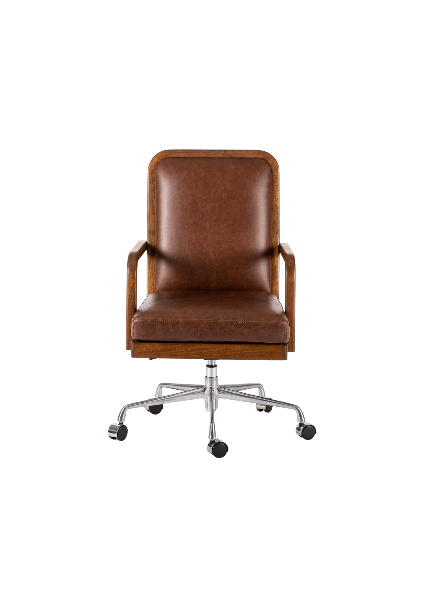 Presenting the Yannis Desk Chair: exquisite craftsmanship fuses aesthetics and comfort with a brown top-grain leather finish and elegant sculpted arms. Refresh your office seating with an ageless, deluxe look.