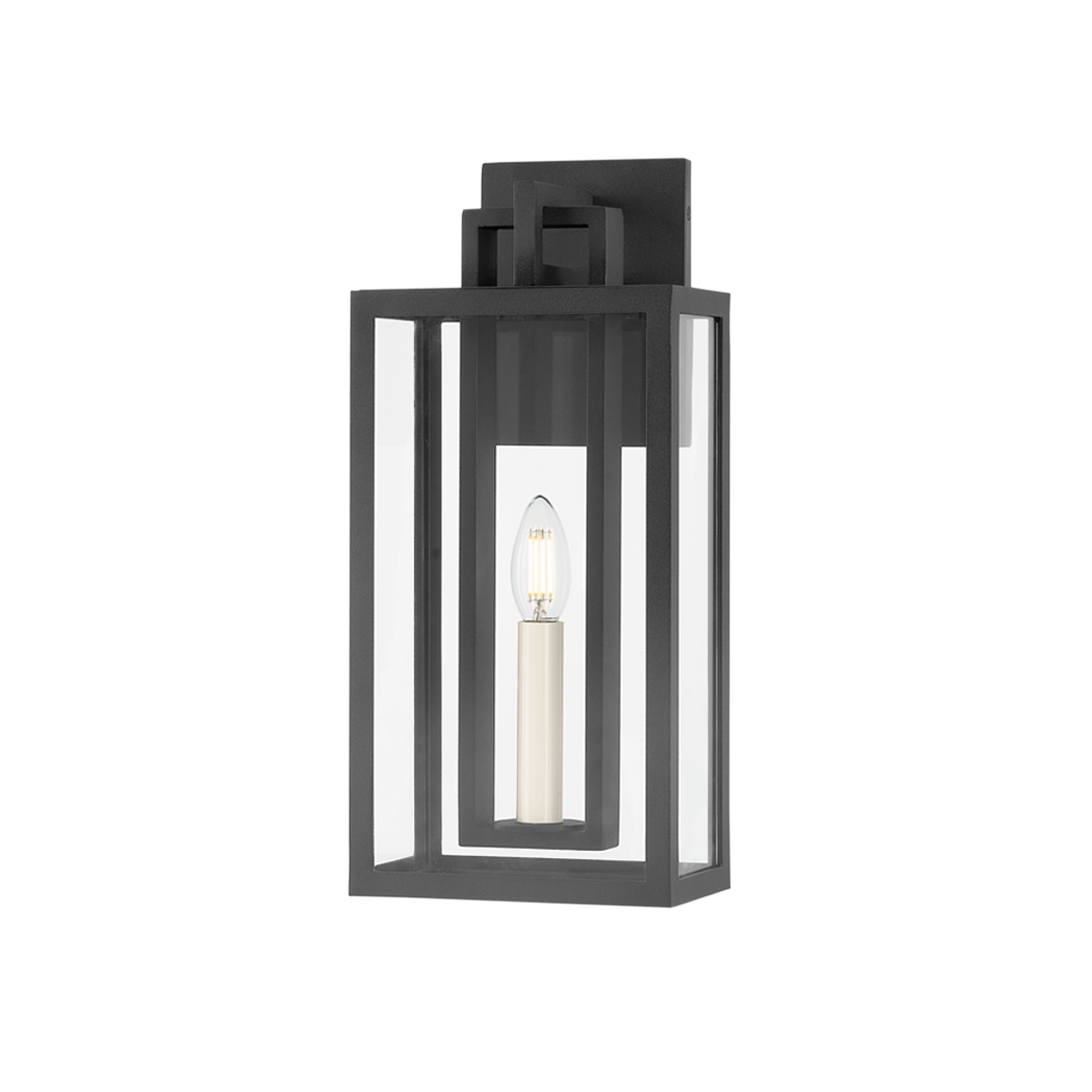 Featuring a sleek rectangular backplate and a minimalist design, the Wallace Outdoor Sconce showcases clean lines and negative space. Clear glass panels encase slender off-white candles, providing optimal lighting within the open, airy silhouette. With a textured black finish, this modern sconce adds a touch of elegance to any exterior and is available in 1-light or 2-light options of different sizes.
