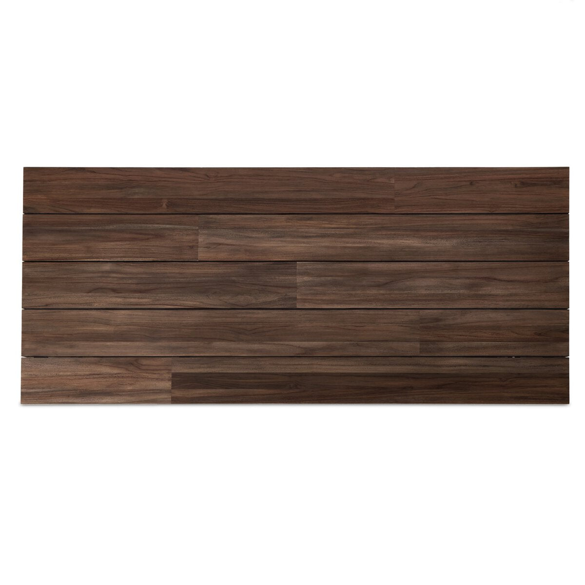 This outdoor dining table features Solid FSC®-certified teak with a stained toasted brown finish, incorporating unique linear joint and connection details. The design is completed with cross stretchers running through the center for added stability.