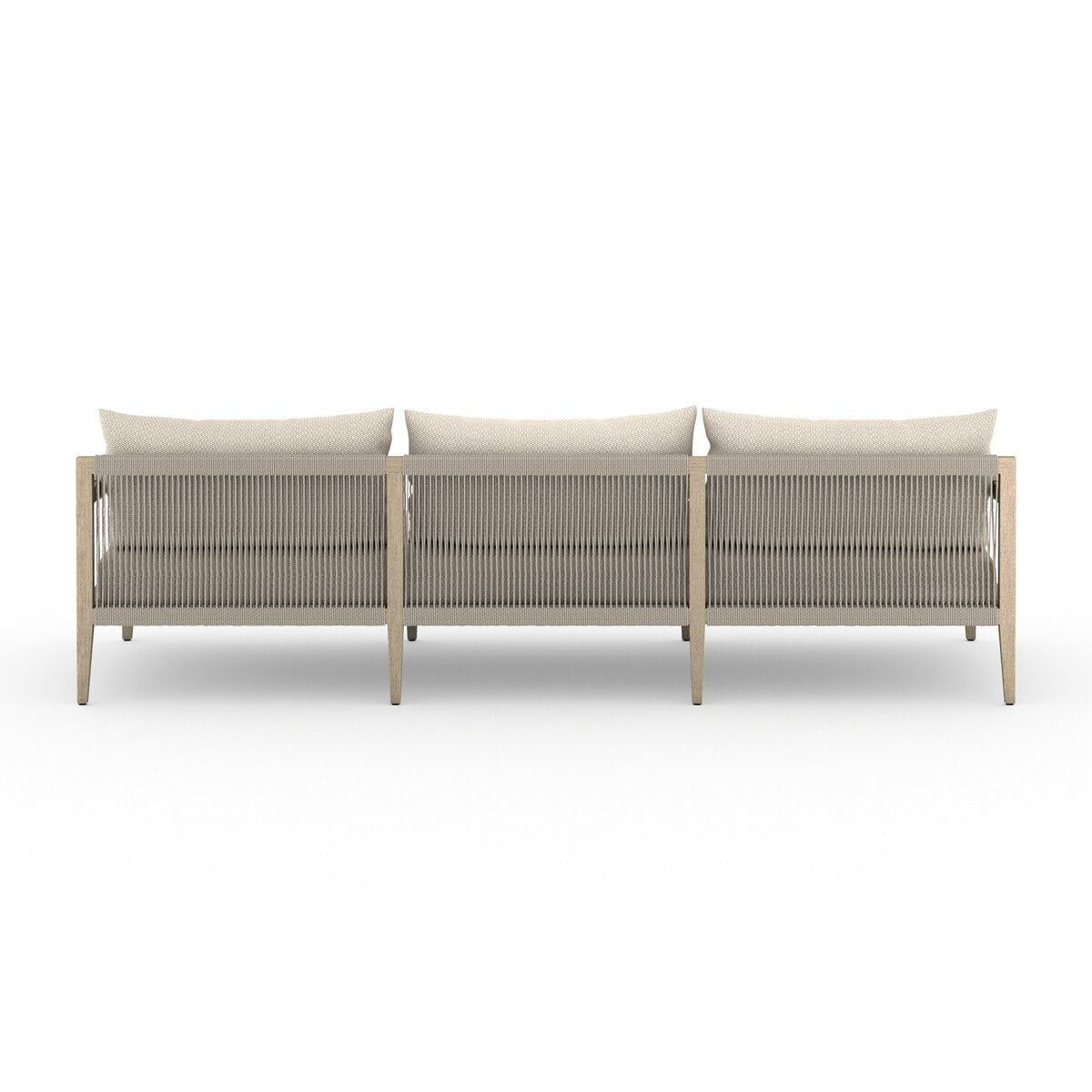 The Viola modern materials shape a stylish outdoor silhouette. Washed brown teak creates a linear frame for UV-resistant, water-repellent Sunproof fabric in light sand. Rope-wrapped armrests and rear cotton weaving add texture. Cover or store indoors during inclement weather.