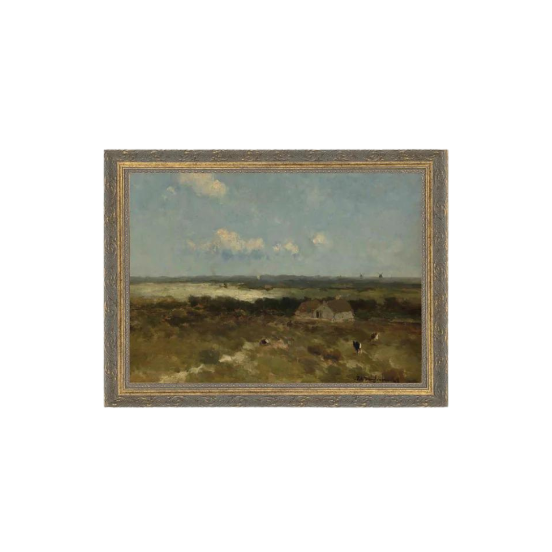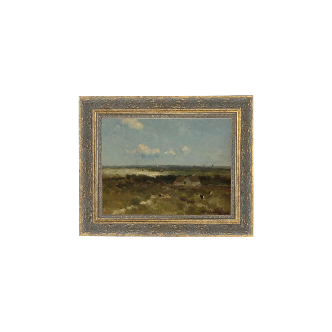 This artwork presents a sweeping view of a quiet rural landscape, with soft clouds drifting across a wide, open sky. The earthy tones and textured brushstrokes capture the beauty of nature and life in the countryside. Framed in a classic, detailed frame, this piece brings the charm of pastoral scenes into focus.
