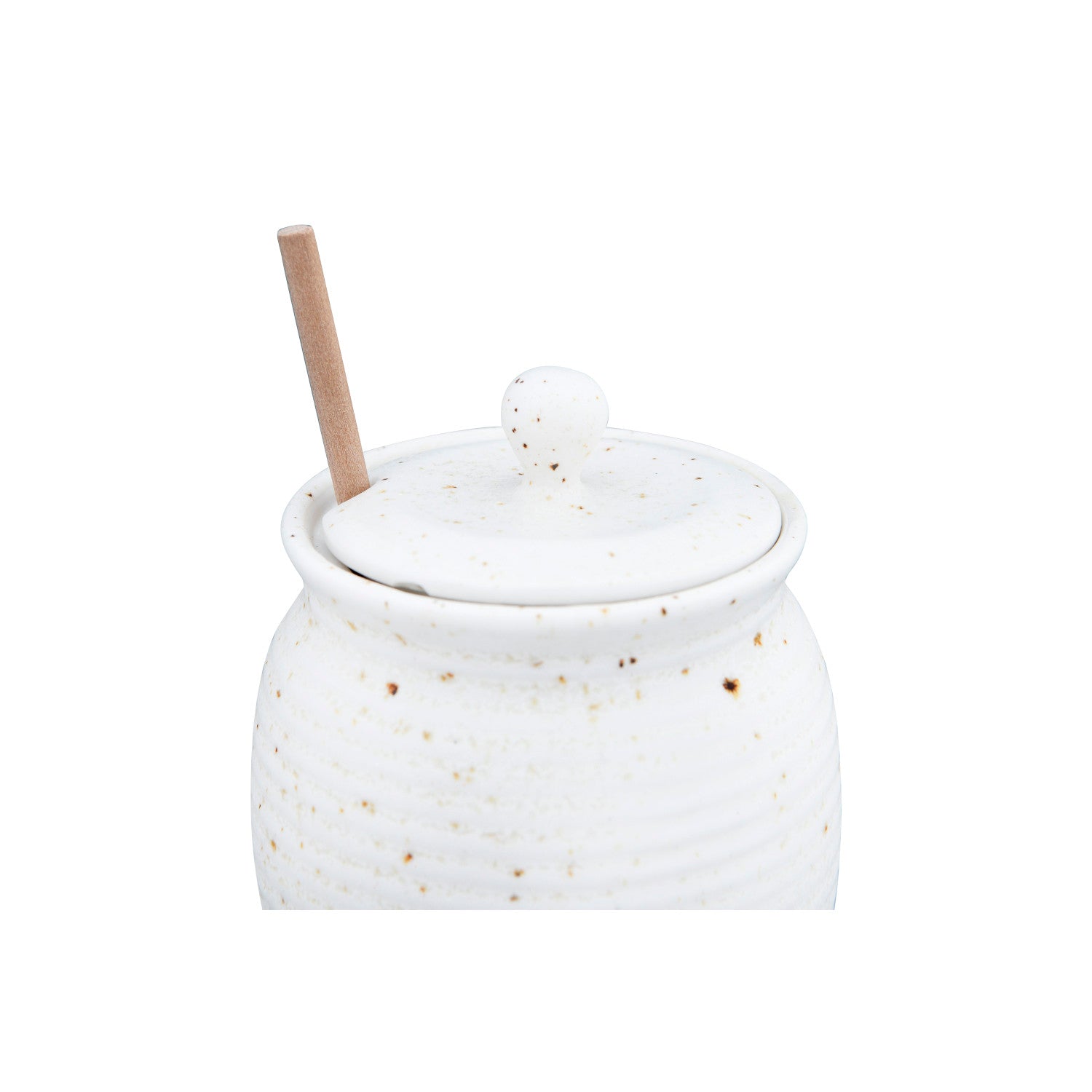 This set includes a charming off-white stoneware honey jar, a lid, and a special wooden honey dipper. The lid features a small opening that allows the dipper's handle to stay conveniently accessible while keeping the rest of the dipper inside the jar.