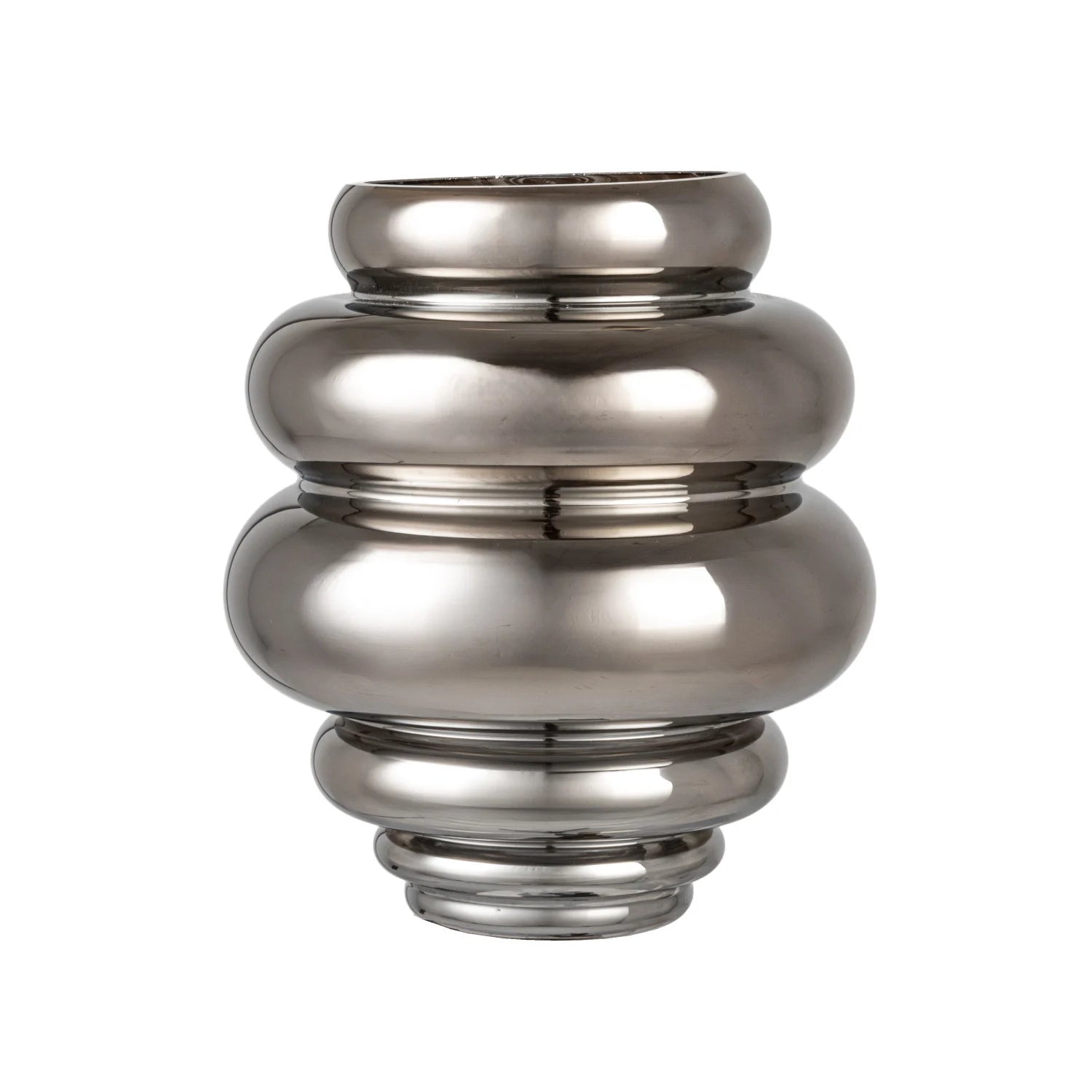 Sleek and sculptural, this chrome-finished glass vase makes a bold statement with its stacked, rounded form. Its reflective surface adds a touch of modern elegance, effortlessly catching the light from every angle. Whether styled with fresh blooms or displayed on its own, this piece brings a contemporary edge to any space.