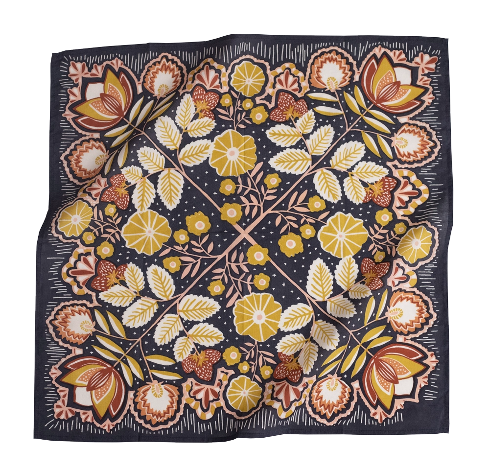 Introducing the Elsie Bandana, featuring a deep navy hue with vibrant red and yellow flowers. This chic accessory, is the perfect addition to enhance your hair or outfit, adding a touch of elegance to any look.