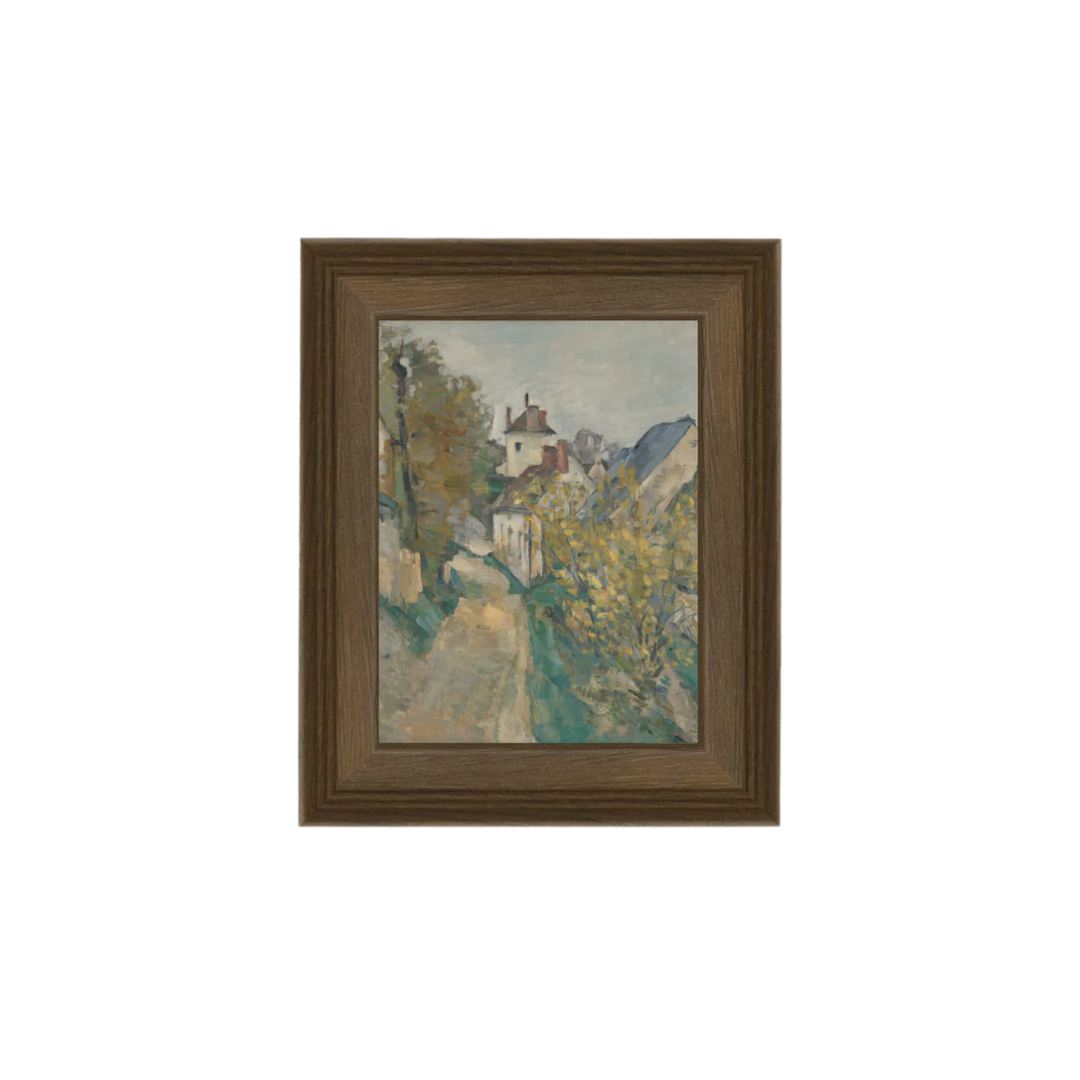 A timeless depiction of a quiet village path, this artwork captures the charm of European countryside living with soft brushstrokes and a muted palette. Framed in a rich wood tone, it brings warmth and character to any space. Perfect for layering into a gallery wall or standing alone as a statement piece.