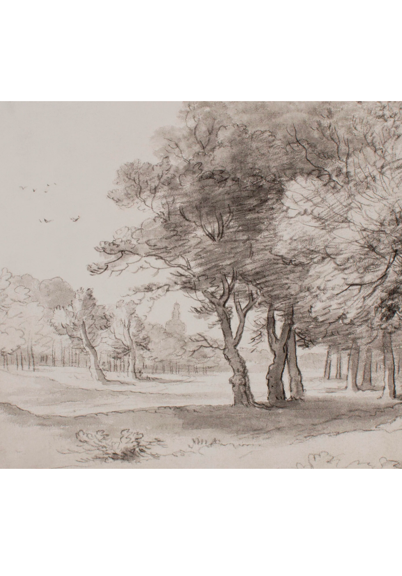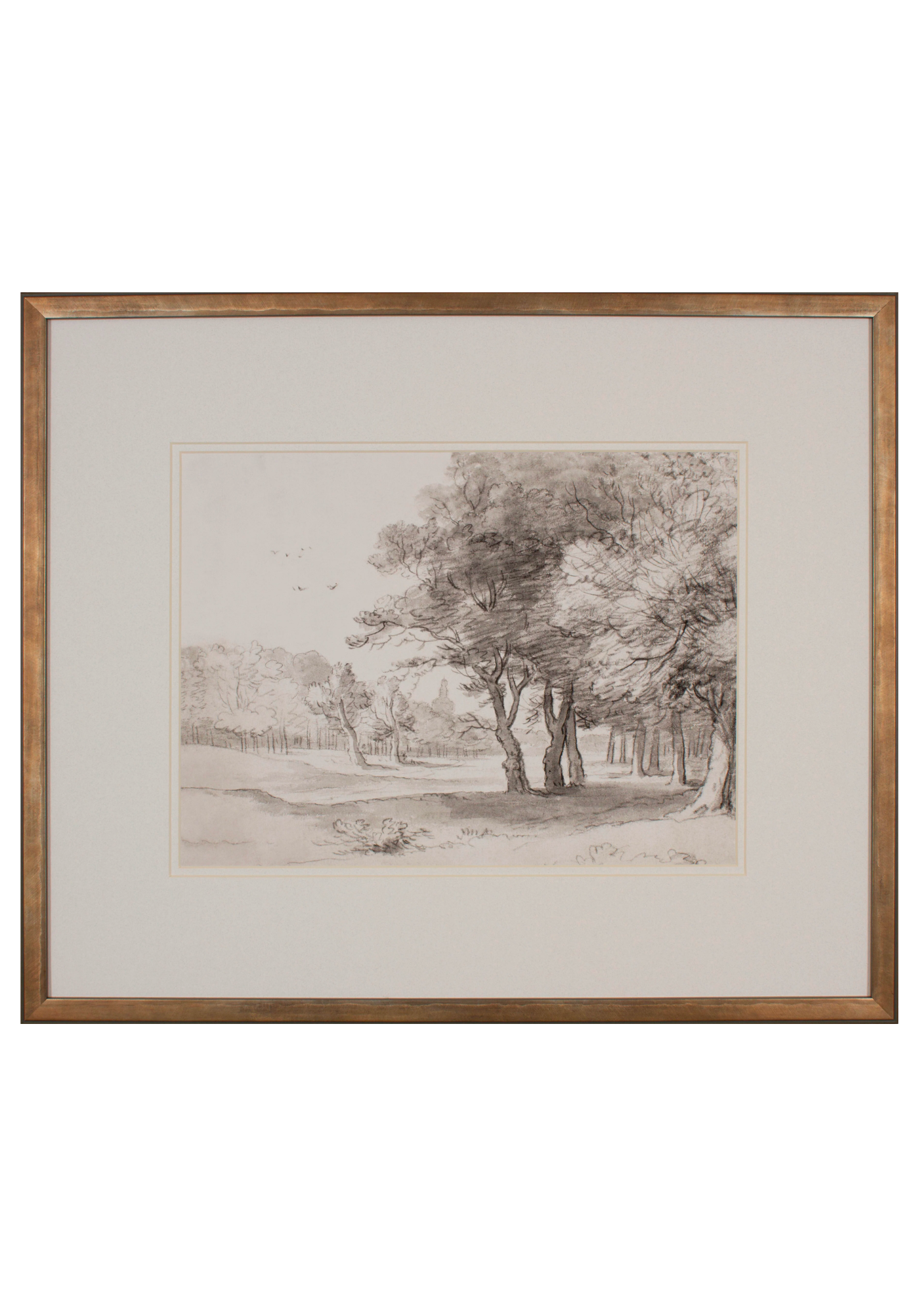 Evoking the quiet charm of a European countryside, View the Hague captures a timeless moment of stillness beneath the trees. Rendered in soft sepia and charcoal tones, the piece portrays a serene forest clearing where dappled light filters through leafy canopies, leading the eye toward the distant horizon. Gentle movement from the birds above brings subtle life to the tranquil scene.