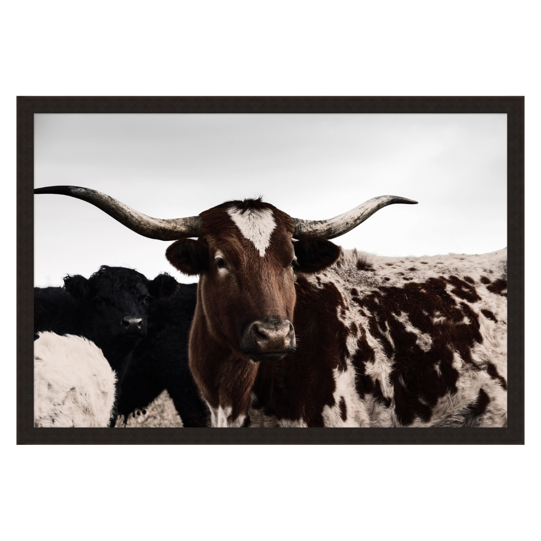 Wise Friend features a striking photograph of a longhorn steer, showcasing its impressive horns. The minimal background and monochromatic tones of the surrounding cattle make the central figure stand out beautifully. This piece adds a touch of rustic charm to any space, celebrating the spirit of the countryside.