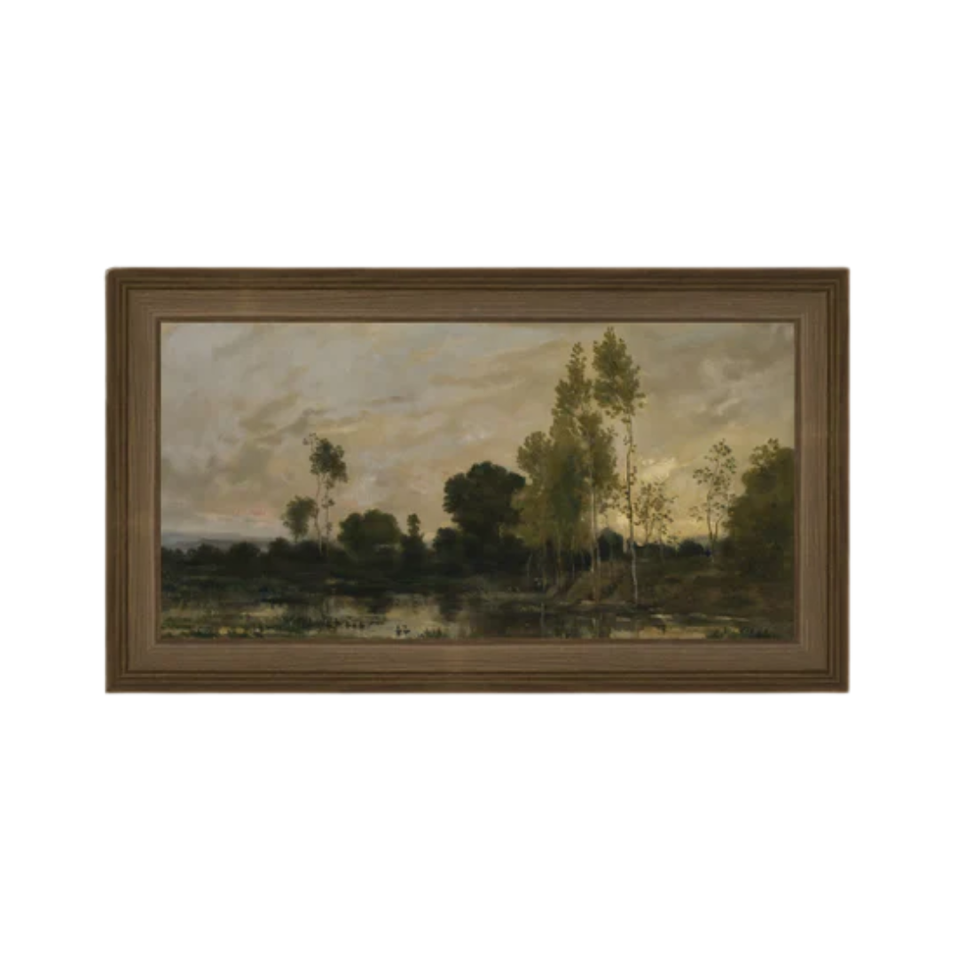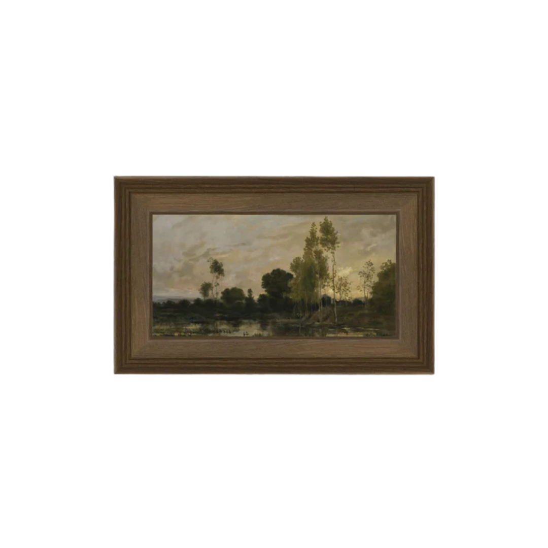 Alders captures the stillness of a wooded wetland at dusk, with moody tones and soft light washing across the sky. The detailed landscape draws the eye with its layered trees, reflective water, and subtle movement. Finished in a warm wood frame, itβs a grounded piece that brings a quiet, natural presence to a wall or shelf.