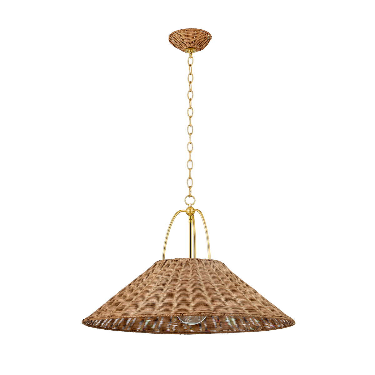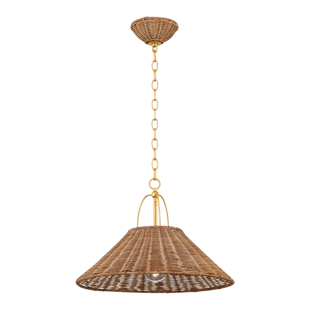 The Danica pendant transforms a heritage silhouette with modern materials. Crafted from Natural Rattan, the shade and canopy offer an earthy yet refined touch to any room. Distinctive metalwork details, finished in timeless Aged Brass, enhance its appeal.