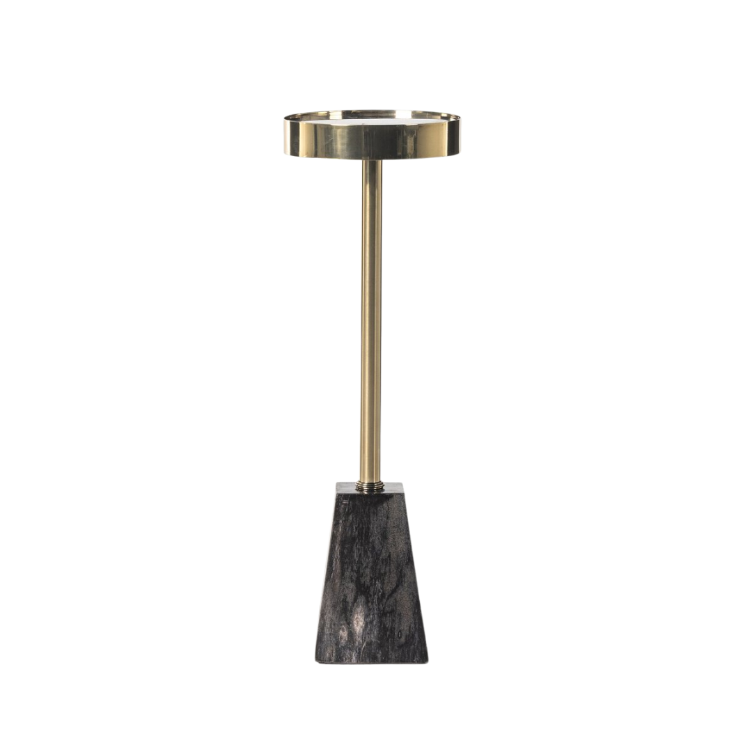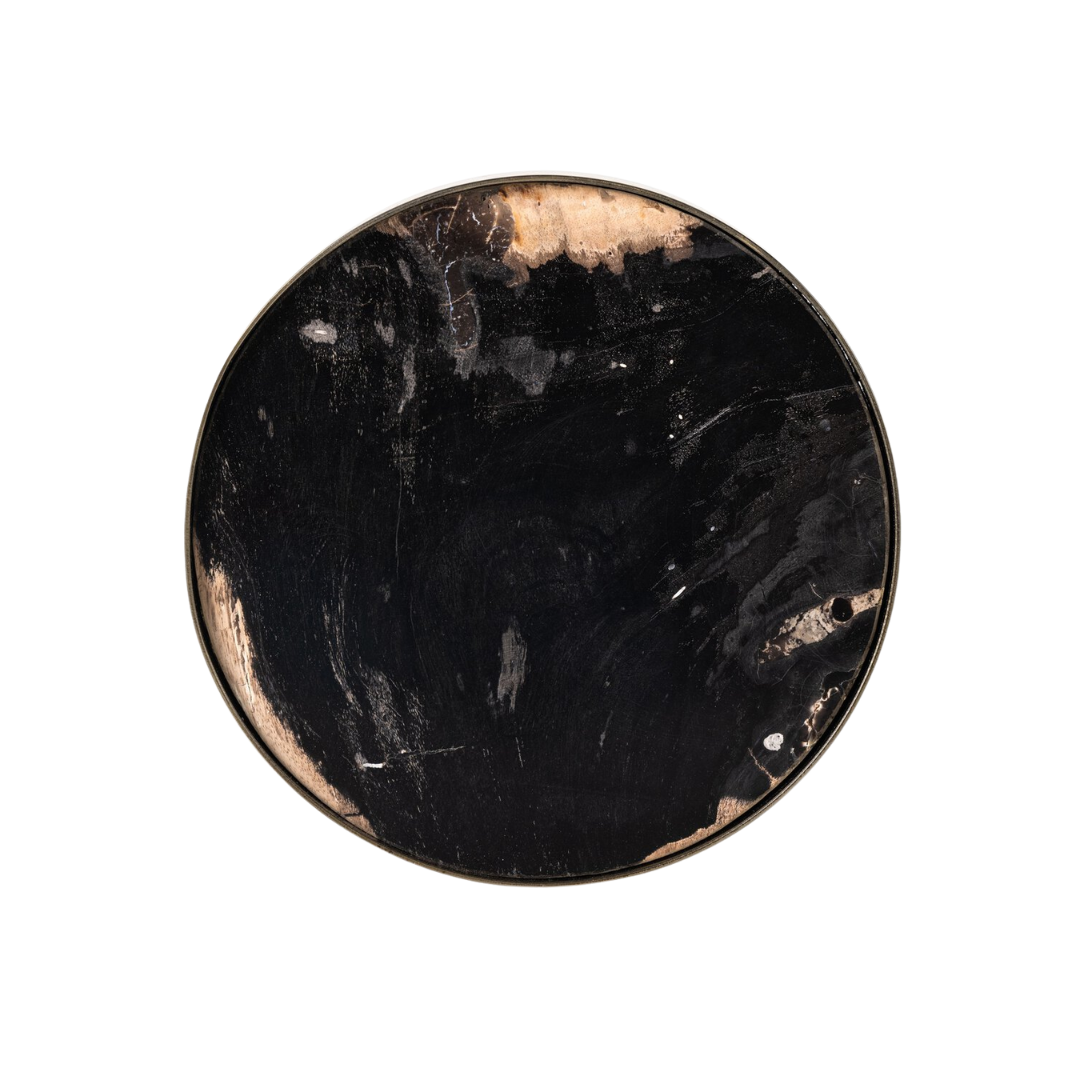 The Monty End Table showcases dark petrified wood's timeless character—ancient fossilized wood transformed into a functional art piece. Each table is one-of-a-kind, with natural variations in tone and mineral patterns. Polished brass details provide warm metallic contrast, elevating the piece from natural curiosity to curated home accent.