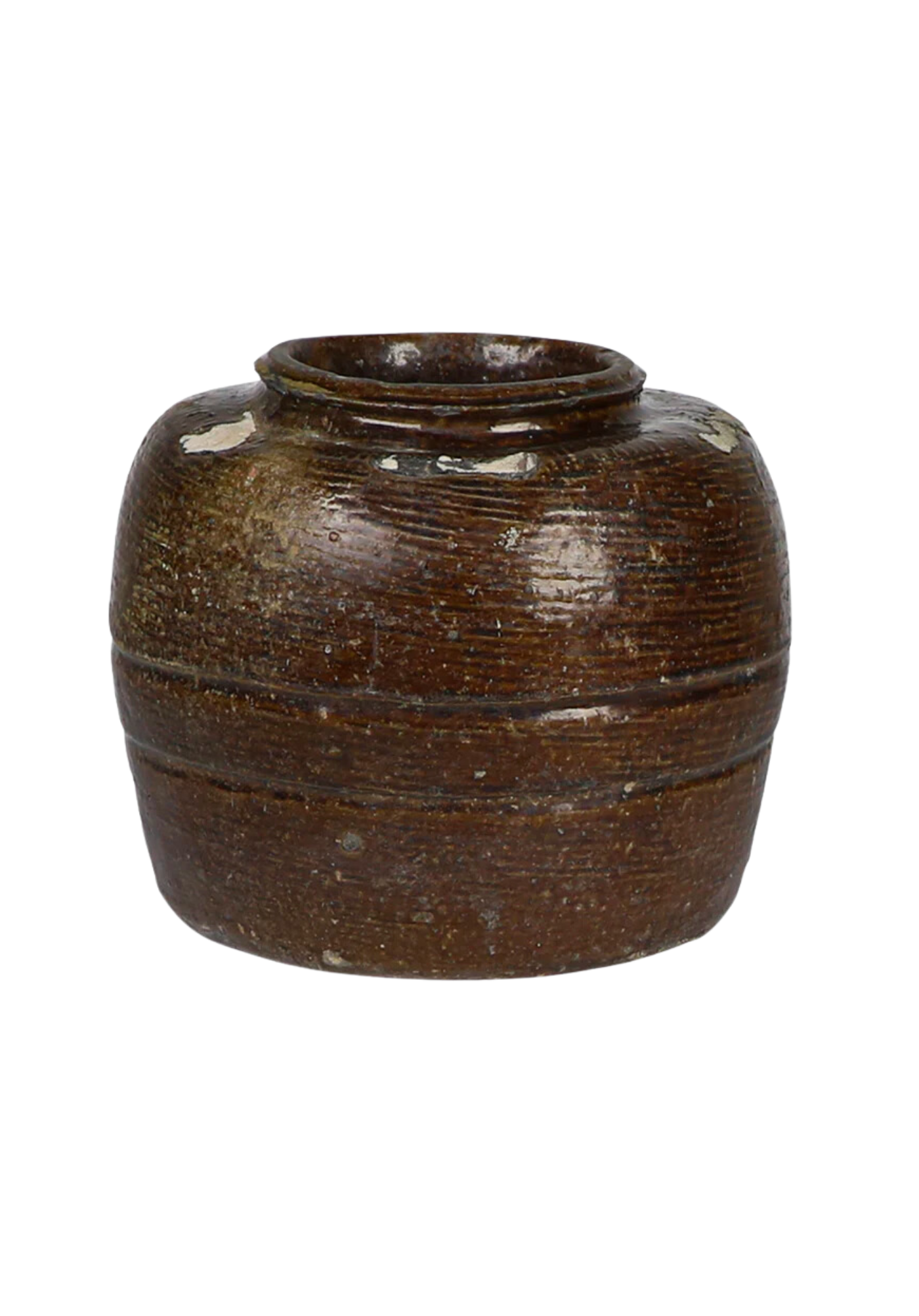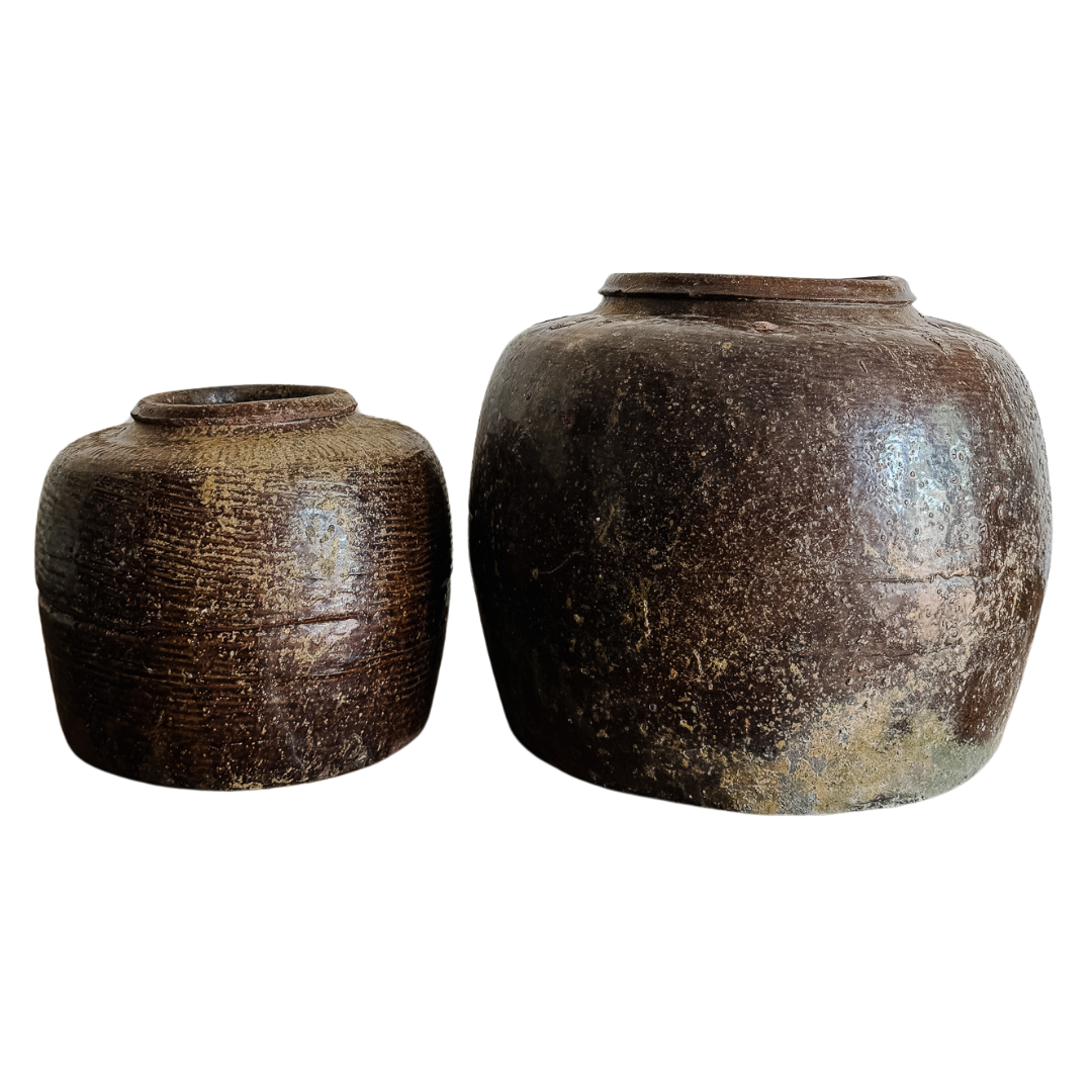 These Chinese Vintage Bean Pots carry an unmistakable charm, handcrafted and age-worn, each pot bearing the decorative accents of time and use. Originally commonplace in Chinese countryside homes, these jars are now sought after for a variety of useful functions. With a unique, dark brown finish, these Vintage Bean Pots are sure to leave a lasting impression!